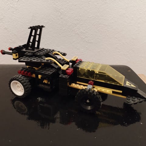 Kuvassa näkyvät Lego Blacktron mallit: Alienator 6876 ja Invader 6894. Kaikki osat muuten paitsi Alienatorista puuttuu toinen keltaisista työkaluista ja Invaderista uupuu aluksen keulan musta logo-osa joka korvattu pelkällä mustalla osalla.