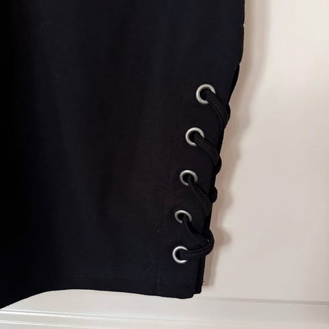 Musta hame, nahkan tuntuista, mutta kevyempi, ohuempi. Käyttämätön, minulle pieni. Koko siinä L, mutta paremmin M. Mittoja näkyy kuvissa.