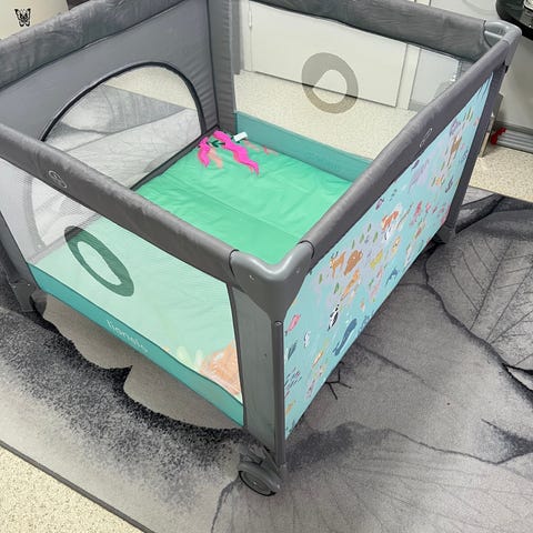 Leikkikehä, 100×104,korkeus 72cm. Pohja ja reunasuojat vahakangasta,joten helppo pitää puhtaana.