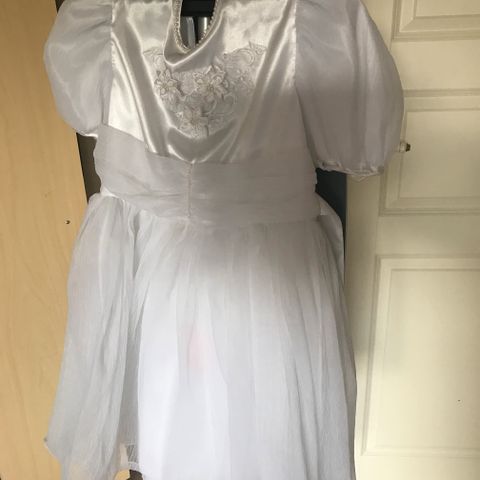 Myydään kaunis kokopitkä morsiustytön mekko. Mekko istuu 158 koossa, mutta hieman liikkumavaraa löytyy vyötärön pitkän rusettinauhan vuoksi. Edessä kaksi ruusukoristetta ja takana rusettivyön lisäksi nappikiinnitys. Helma on kolmikerroksinen. Mekko on ollut käytössä vain kerran ja on uudenveroisessa kunnossa. Materiaalina satiinia ja sifonkia.