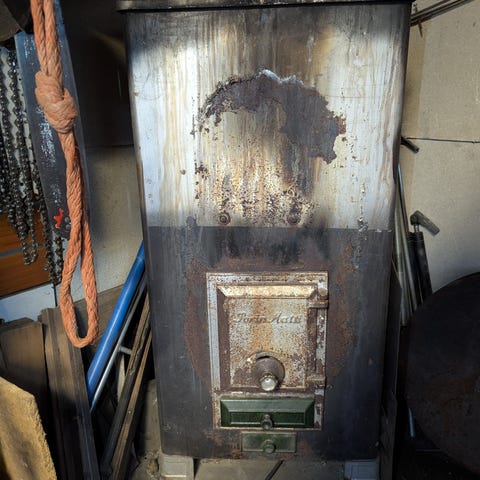 Tuhkaluukku puuttuu. Yksi jalka irronnut, mutta sen saa mukaan.