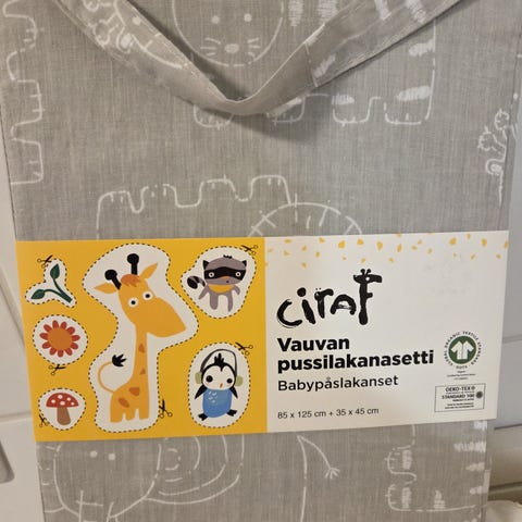 Vauvalle pussilakana ja tyynyliina. Peittoa käytetty enempi ja se haalistunut, tyynyliina käyttämätön. 100% puuvillaa
