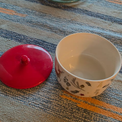 Pieni, söpö emali kulho, astia, kippo.... kovasti kulunut reuna, kansi vähemmän. Voi vielä käyttää kuivatavaralle, esim. Sokerikippona.