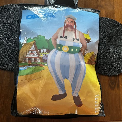 Tukevasta, huovan tyylisestä kankaasta ommeltu naamiaispuku. Pituus olka-helma n. 100 cm ja kainalo-kainalo 2 x 48 cm.