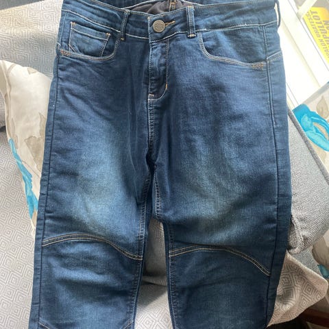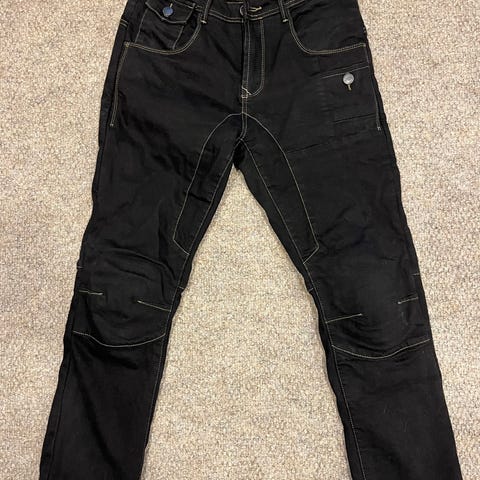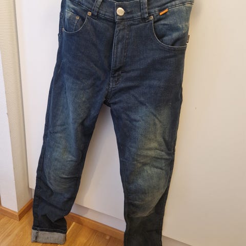 Ajofarkut, joissa polvissa kovikkeet. Vasemmassa lahkeessa pientä öljytahraa (näkyy kuvassa), ei ole pesty koneessa. Koko W30 L34.