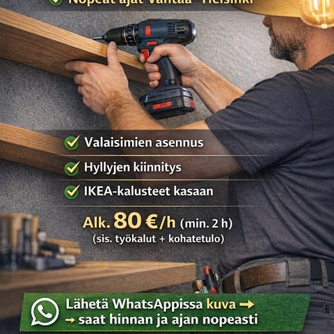 Kokoan kaiken sohva- ja ruokapöydistä vaatekaappeihin ja toimistokalusteisiin (ei keittiökaappeja) 10 vuoden kokemuksella. Tarjoan myös TV:n ja muiden kalusteiden seinäkiinnityksiä.