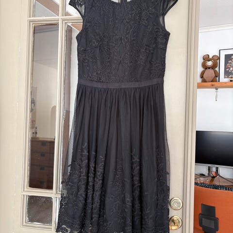 Espritin pitsinen kaunis juhlamekko. Musta pitsi, alusmekko viininpunainen. Koko L, vastaa kokoa M. 25€+pk. Kotkassa.