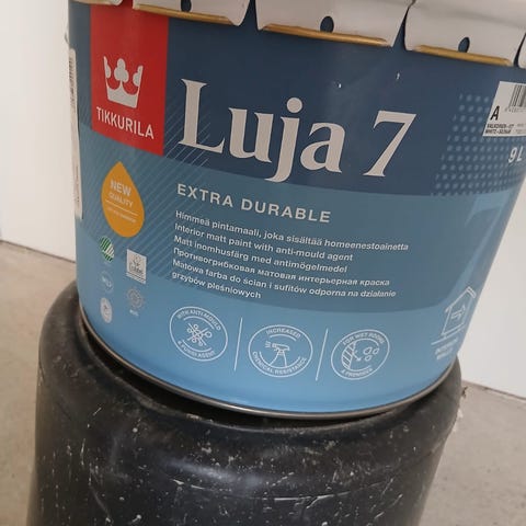 Avattu 18l purkki luja 7 sävyssä G487 Batisti ja luja 7 sävyssä 1930 vaaleanharmaa. Molempia reilusti jäljellä. 50€/purkki.