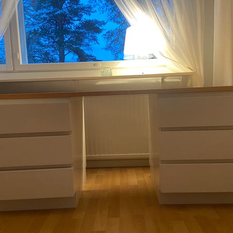 Muurame työ-/kirjoituspöytä laatikostolla. Valkoinen, pöydän päädyissä koivureunus. S 52cm, L 109 ja K 67cm.