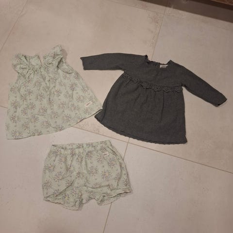 Käytetty kohtalainen kunto. Neuletakissa hihassa ja nappilistan yläosassa jotain haaleaa tahraa. Muutenkin paljon käytetty. Housut siistit ja bodyssakaan ei normaalia käytönjälkeä kummempaa. Kaikki ehjiä. Body 62 cm, pitsisomisteinen neuletakki 68 cm ja housut 74 cm.
