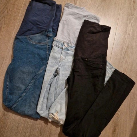 Myydään käyttämättömät äitiyslegginsit koossa S. Etupuoli kiiltopintaista "tekonahkaa", takapuoli kangasta. Postitus onnistuu.