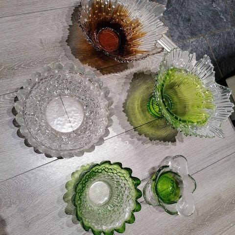Kuvassa olevat vihreät lasiastiat/-koristeet myynnissä