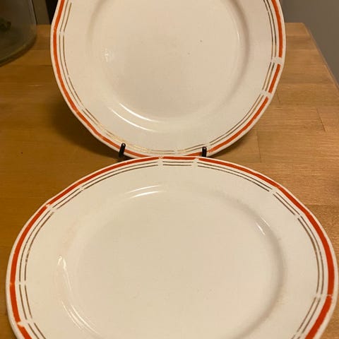 Kaksi kappaletta Arabian lautasia. Näissä reunan kultaus on erittäin hyvin säilynyt. Ikäisekseen todella hyvässä kunnossa eikä pohjassakaan näy käytön jälkiä.