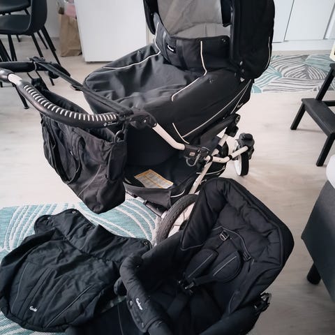 Rakkaudella pidetyt yhdistelmävaunut Emmaljungalta. Nahkainen musta Ergo ratasistuin, joka on ergonominen heti istumavalmiuden täytyttyä pitkälle leikki-ikäiseksi asti. Lounge Black vaunukoppa, Tässä mallissa tuuletusikkuna päädyssä, sekä kuomun alta taittuva lippa. Patja ja jalkapeite pesty hajusteetta. Rungossa normaalia käytönjälkeä, yleisilmeeltään oikein siistit, puhtaat vaunut. Kyseessä ei ole uudet vaunut, renkaan pinnalla pientä kulumista, mutta eivät todellakaan loppuunkäytetyt. Lisäksi jarru ei aina pidä joka kolossa molemminpuolin 100%, jarrukolot kuluneet renkaan sisältä. Ehjä, musta nahkapäällysteinen työntöaisa.