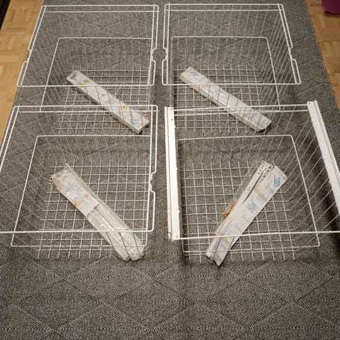 Myyntiin kaksi erillistä settiä uusia ja todella laadukkaita Inaria / Finnmirror Libra 180 -liukuovikaappiin sopivia rullakiskokoreja kiskoineen. Yhdessä setissä neljä (4) koria eli kaksi (2) matalaa ja kaksi (2) korkeaa koria.