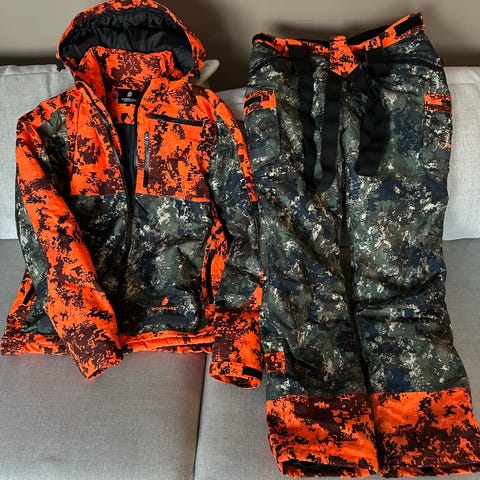 Pinewood, M metsästyssetti, metsästystakki ja housut. Paljon, paljon käytetyt. En ole varma teknisistä ominaisuuksista (vedenpitävyys), mutta edelleen käypä setti metsälle ja ulkoiluun