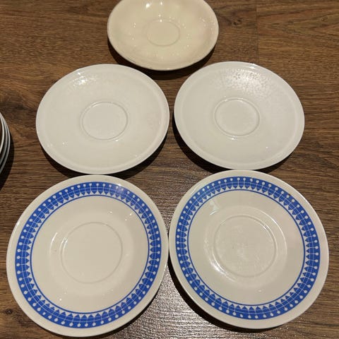 Myydään kuvan vanhat Arabian kahvikupin aluslautaset. Sinertävät, halkaisija 14 cm, mallista ei tietoa. Kunto ok, yhden reunassa pienen pieni kolhu, vrt. kuvat. Nouto Helsingin Lauttasaaresta tai postitus ostajan laskuun.