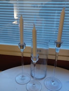 Lasimaljakko, k 30 cm. 3 kynttilänjalkaa, korkeudet n. 28, 32 ja 25 ja lyhty.