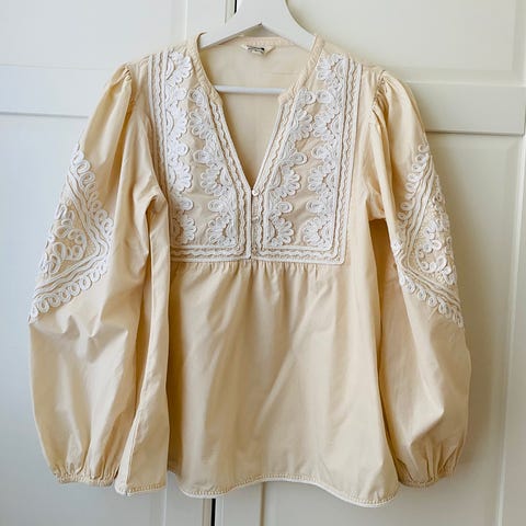 Hiemän läpikuultava kesäpusero. Materaali kauniisti laskeutuvaa viskoosia. Rinnanympärys 1/2 mitta (kainalo-kainalo) 45cm, Pituus 57 cm.