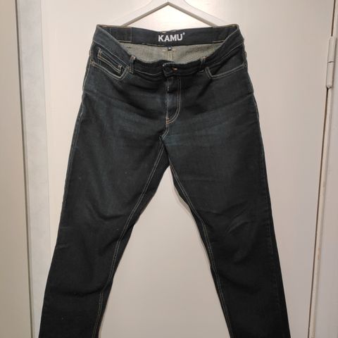 Myynnissä Kamu-merkkiset tummansiniset farkut. Lahkeen pituus vyötäröltä nilkkaan 100cm.