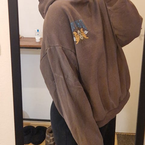 Valkoinen pull&bearin huppari koossa S. Vähän nukkaantunut. Viimeisissä kuvissa näkyy hupun naruissa hieman keltaista likaa. Näkyy kuitenkin vain tietyssä valossa.
