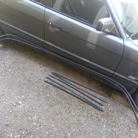 Vajaa sarja käytettyjä ulkopuolen listoja. Puuttuu muistaakseni kuskin puolen ovien listat. Listat suoria mutta vaatinee vähintäänkin putsauksen jos ei jopa maalauksen. Jokunen kiinnike taitaa myös uupua. 40€ Kuvasta poiketen myös ovipahveihin kuuluvat listat tulee mukaan
