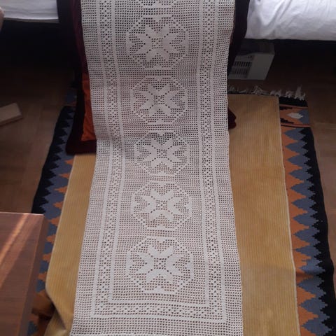 Erittäin siisti ja hyväkuntoinen virkattu peitto kalastajalangasta, pit. 185cm ja lev. 165cm