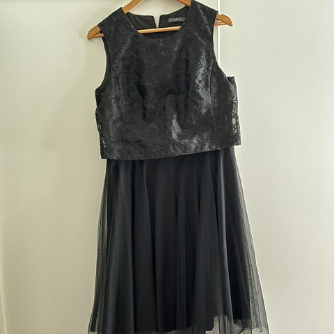 Levenevähelmainen tummansininen pitsimekko Esprit, takana pitkä vetoketju ja solmittava sifonkinauha. Vuorillinen.