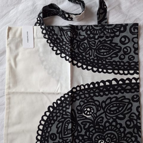 Marimekko Satula kangaskassi. Koko 44 x 43 cm hihnat. Materiaali on 100% puuvilla. Uusi, täysin käyttämätön, laputkin ovat vielä kiinni.