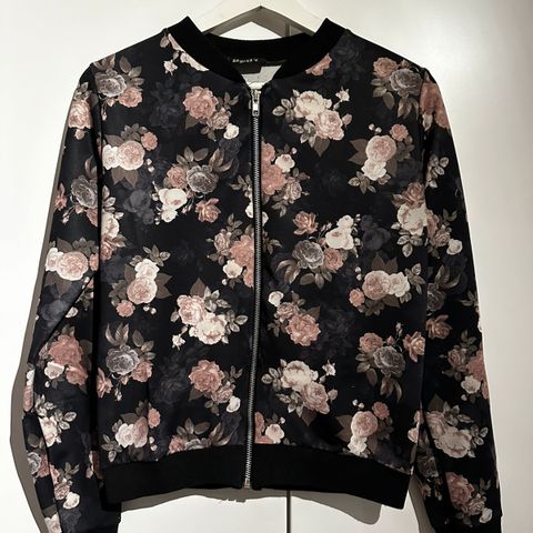 Punainen collegetakki, jossa huppu sekä vasemmassa hihassa ja vyötäröllä taskut. Koko S