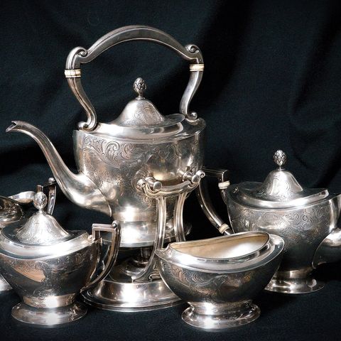 Hieno hyväkuntoinen hopeinen tarjoilusetti: sokerikko, kermakko, sokeripihdit ja aluslautanen.