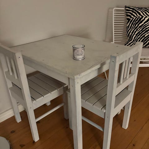 Itse tehty pikkupöytä vuodelta 2020. Mäntypuulevyä. Maalattu kalustemaaleilla (pinkihkö/liilahko maali kalkkimaali Rust-O-leum). Valkoinen on puolikiiltävä valkoinen, kaiketi Teknos. Meidän lapset isoja tälle. Kaipaa vähän uutta maalia, mutta tämän saa maalausta varten helposti palasiksi, torx-ruuveilla kasattu.