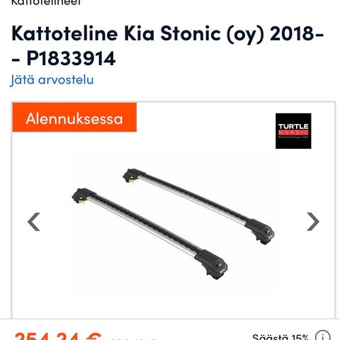 Merkkikohtaiset kattotelineet Kia Stoniikkiin, auton vaihdon vuoksi itselle tarpeettomat. Telineissä pidikkeet kumilenkeille.
