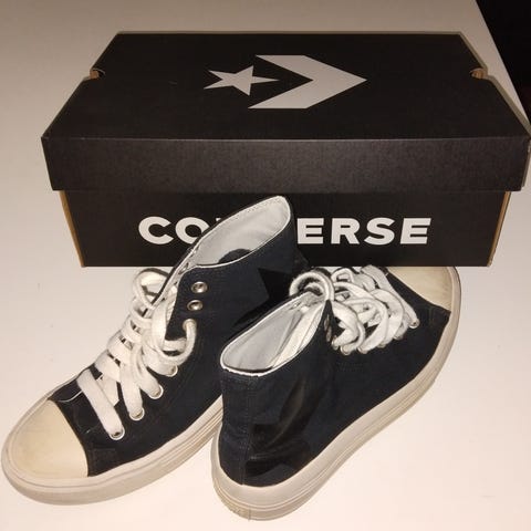 Myydään paksupohjaiset converse tennarit. Kaipaavat pesua, toisessa kengässä kumiosassa liimaus hieman kulunut (kts. kuva), voisi olla korjattavissa, mutta ei haittaa käyttöä.