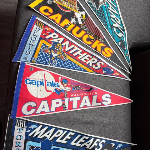 Ostetaan kuvanmukaista sarjaa olevia hyväkuntoisia NHL- viirejä. Tarjoa rohkeasti jos sinulta löytyy. Kuvat ovat esimerkkejä siitä, mitä sarjaa on hakusessa. Voit tarjota myös muita vanhoja viirejä entisiltä NHL- joukkueilta esim.