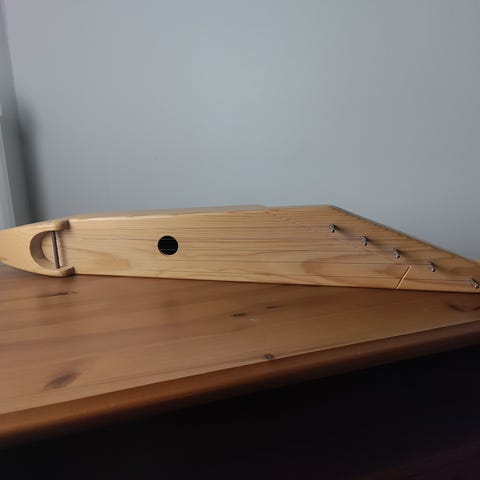 Muutoin hyväkuntoinen viisikielinen kantele, mutta yksi kieli poikki.