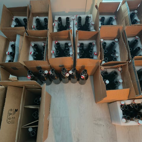Patenttikorkilla varustettuja ruskeita pulloja esim. Oluelle ja siiderille. 38 kpl