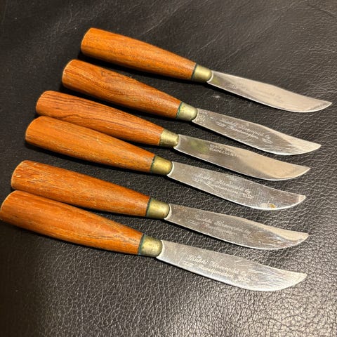 Meille käytettynä ostetut ilmeisimmin hedelmäveitset. Ei kuitenkaan ole päässeet käyttöön. Huoltoa kaipaa ainakin toinen, jossa lovia terissä ja holkki vai mikä lie vähän liikkuu (näkyy kuvissa).