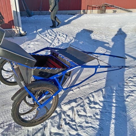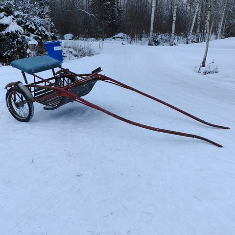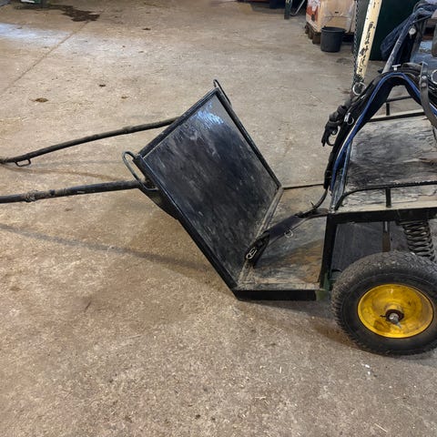 Shetlannin ponilla käytössä olleet koppakärryt. Metalliosissa jonkinverran pinnassa ruostetta, mutta muuten varsin toimivat.