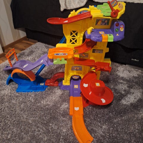 Myydään kuvienmukaiset Vtech Toot-toot drivers autorataosat ja autot. Useampi erilainen, mm. parkkitalo, kilparata, monitoimirata, stuntshow ja setti lisäpaloja. Kolme kauko-ohjattavaa autoa ja kolme käsin liikuteltavaa autoa, kaikki toimivat ja pitävät ääntä. Poliisiauto ja monsteriauto puhuvat saksaa, muut suomea. Kaikki patteria vaativat osat testattu ja toimivat. Ei sisällä nyt pattereita varastoimisen vuoksi. Ohjeita ja ylimääräisiä tarroja tallessa, kuuluu pakettiin. Rataosat syö AA-pattereita ja autot sekä ohjaimet syö AAA-pattereita. Tornin yksi lukitus osa hieman vääntynyt, ei haittaa kasaamista tai koossa pysymistä.