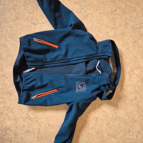 Playtechin perhoskuvioinen softshell ulkopuku, 110cm. Sisäosa fleeceä, irrotettava huppu. Puvussa tummentumaa, mutta ehjä.