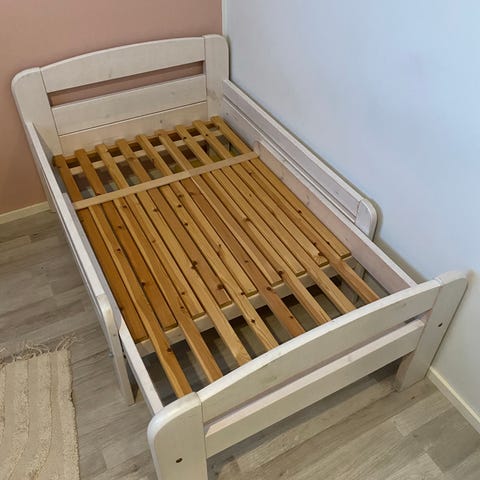Puurunkoinen valkoiseksi maalattu lasten jatkettava sänky. Sivuilla lähellä tyynypäätyä on kaarevat laidat.
