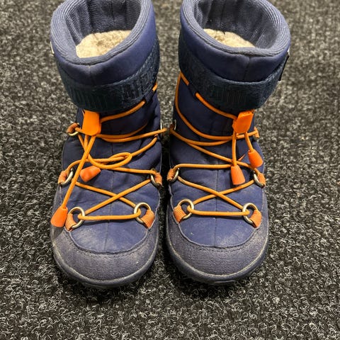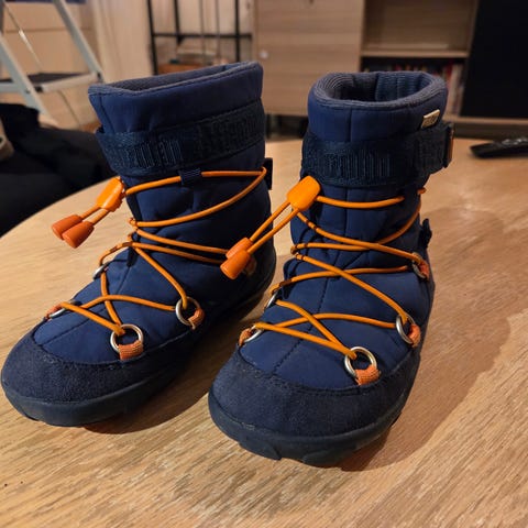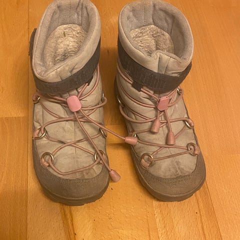 Affenzahnin talvikengät kalvolla. Ei päästäneet vettä läpi kosteallakaan kelillä. Ulkonäössä jo moitteita, nauhat rispaantuneet ja tummia värjäytymiä pinnassa. Näitä ei ole pesty, värjäytymät saattaisivat lähteä pesussa. Edelleen hyvässä käyttökunnossa, kohtalainen merkintä ulkonäön vuoksi.