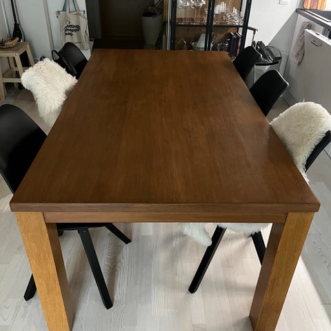 Cobellosta ostettu täyspuinen tammiruokapöytä. Todella jykevä ja tukeva, ollut erinomainen lapsiperheessä. Rustiikkiseen ilmeeseen kuuluvaa puunpintojen näkymistä ja osittaista kulumaa. Erityisesti pöydän pintaan on tullut maaliin kulumaa ja joitakin tussin jälkiä. Myös jaloissa kulmissa jonkin verran kulumaa. Jos pöytälevyn hioo ja käsittelee uudelleen saa tästä itselleen todella laadukkaan ja hyvän pöydän.