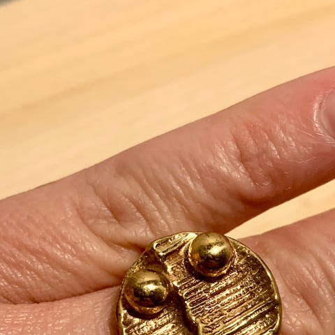 Kotimainen Salovaara-sormus, jossa on kauniisti istutettu vaaleanvioletti jalokivi. Hopealeima on ajan myötä kulunut pois.