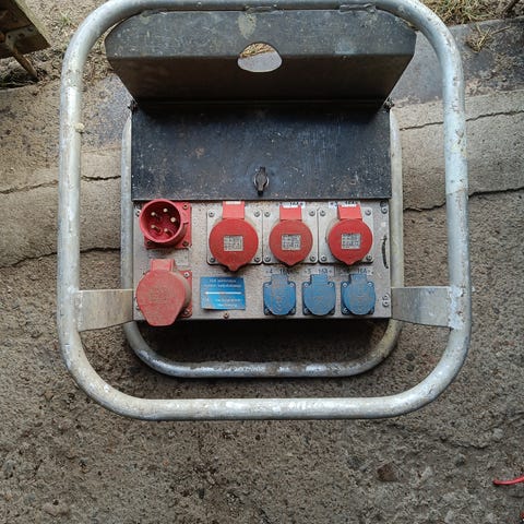 Työmaakeskus jalustalla ja kumikaapelilla. Ei mittaria.