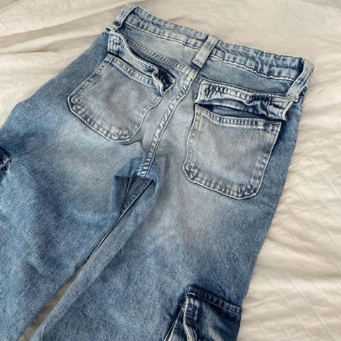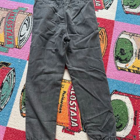 H&M siniset jogger jeans housut, koko 140 (vähän nafti pituus). Vyötäröllä ei kiritysmahdollisuutta, ei taskuja. Ohutta, pehmää farkkua, rypytykset lahkeissa ja vyötäröllä. Oikein siistit. Savuton ja karvaton koti.