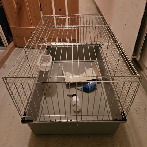 Noin puolivuotta vanha jyrsiän häkki + tarvikkeita. Kuletuskoppa mukaan