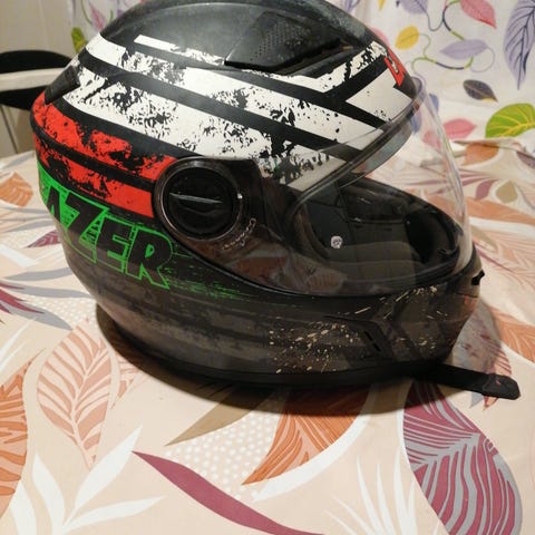 Kypärä on ollu pari vuotta käytössä, siinä on vähän naarmuja mutta ehjä, visiiriä kun nostaa ylös niin se voi helposti irrotautua toisesta sivusta kypärää mutta sen voi laittaa takas paikoilleen