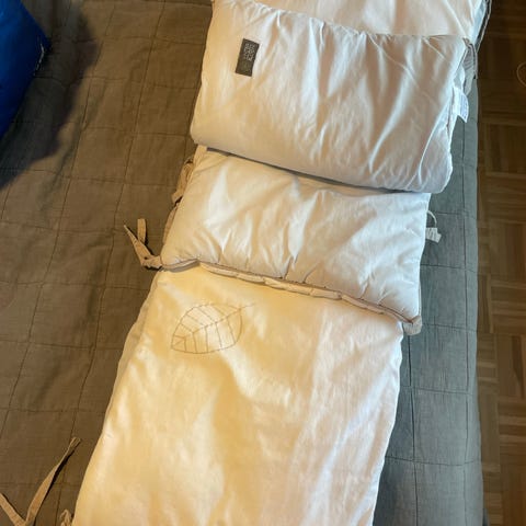 Kuvan siisti pehmuste pinnasänkyyn. Valkoinen. Vähän kellertävää värjäymää. Pituus 400cm leveys 20cm. Riittää tavallisen kokoisen pinnasängyn ympäri.
